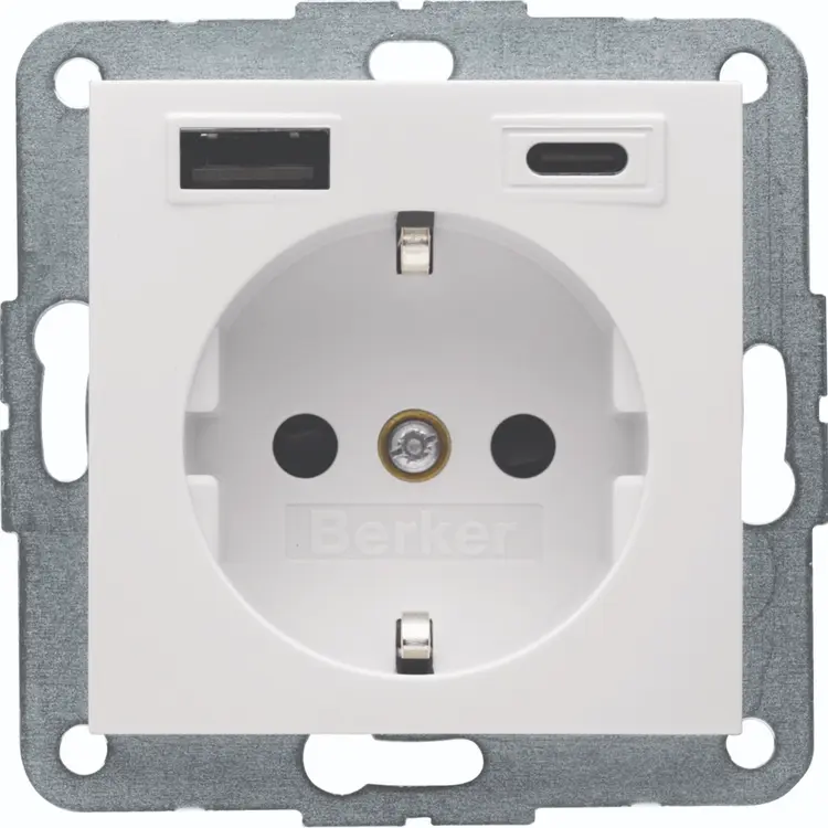 Hager Berker randaarde wandcontactdoos met USB-A- en USB-C-aansluitingen. De USB-C ondersteunt USB Power Delivery (USB-PD). Uitgangsstroom: USB-A max. 1,0 A (5,0 V), USB-C max. 3,0 A bij 5,0 V of max. 2,22 A bij 9,0 V. Serie: S1/B3/B7, kleur: wit glans.        	        	Meer informatie »
