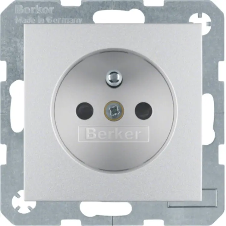 Hager Berker stopcontact met penaarde (België) en verhoogde aanraakbeveiliging (kindveilig). Voorzien van klauwbevestiging (spreidklemmen). Aansluiting bedrading: steekklemmen. Exclusief afdekraam. Serie: S1/B3/B7, kleur: aluminium mat.
