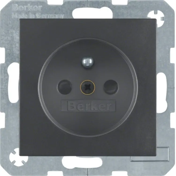 Hager Berker stopcontact met penaarde (België) en verhoogde aanraakbeveiliging (kindveilig). Voorzien van klauwbevestiging (spreidklemmen). Aansluiting bedrading: steekklemmen. Exclusief afdekraam. Serie: S1/B3/B7, kleur: antraciet mat.
