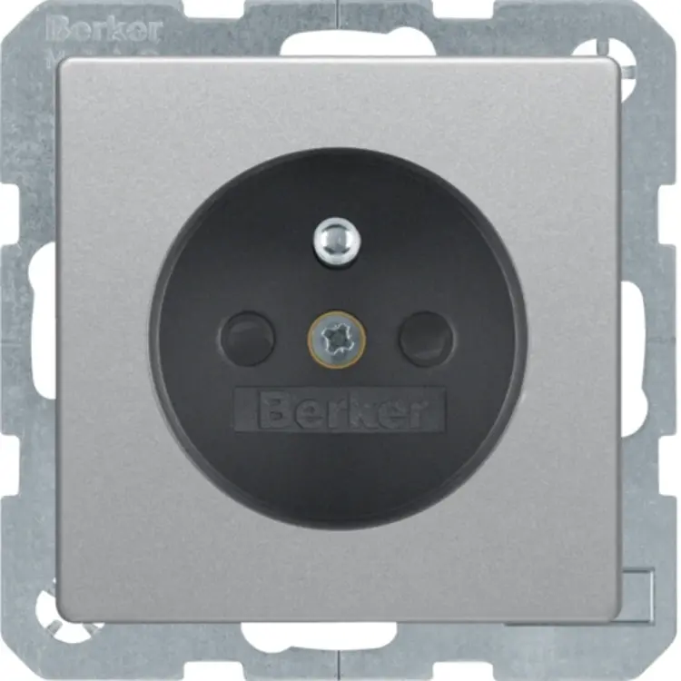 Hager Berker stopcontact met penaarde (België) en verhoogde aanraakbeveiliging (kindveilig). Voorzien van klauwbevestiging (spreidklemmen). Aansluiting bedrading: steekklemmen. Exclusief afdekraam. Serie: Q1/Q3/Q7, kleur: aluminium mat.