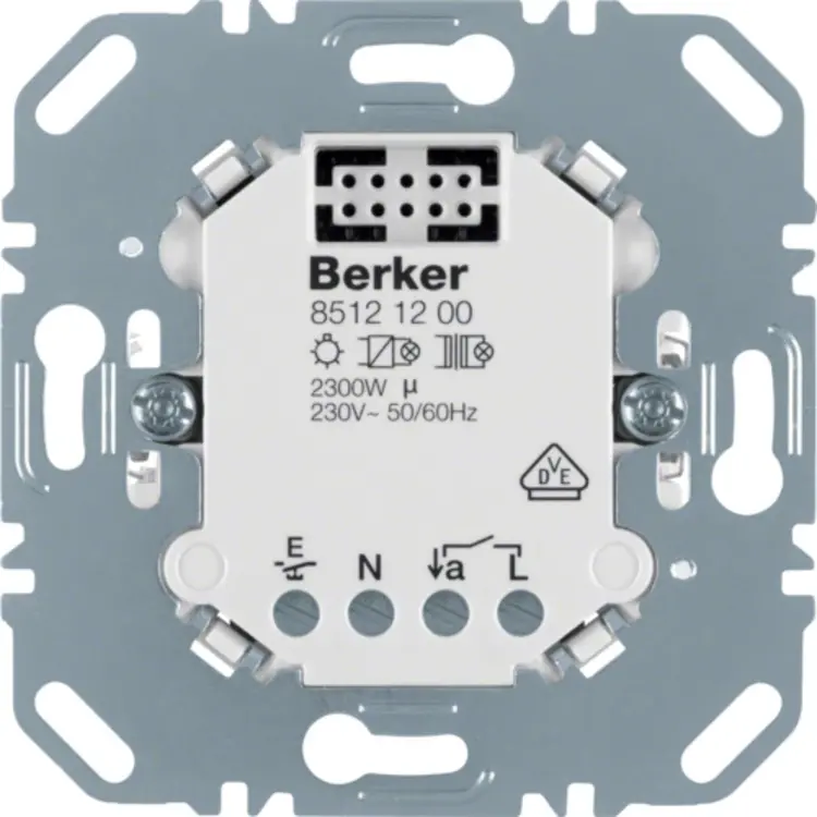 Hager Berker relaisschakelaar, 1-voudig. Nuldraad vereist. Met bijpostingang voor impulsdrukker (maakcontact), éénvlakbediening en voor bijpost-bewegingsmelder. Af te dekken met tastdimmerknop (85141xxx) of opzetstuk voor bewegingsmelder (85341xxx).
