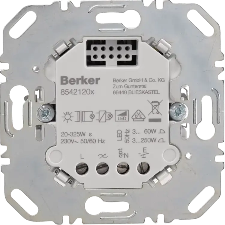 Hager Berker comfort-tastdimmer voor LED-, gloeilamp- en halogeenverlichting (230 V en 12 V bij halogeen). Zie omschrijving voor de maximale belasting. Werkt met fase-aan- en fase-afsnijding, instelbaar bij de afdekking. Geschikt voor wisselschakeling*. Beschikt over een optionele nul-klem. Exclusief knop en afdekraam.