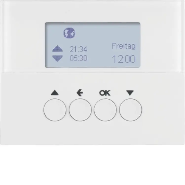 Hager Berker schakelklok opzetmodule voor jaloeziebesturing. Handmatige, tijdgestuurde en automatische bediening van jaloezie- en rolluikmotoren. Voorzien van instelbare tijdprogramma’s, astrofunctie met tijdverschuiving en vakantieprogramma. Niet geschikt voor het schakelen van verlichting. Exclusief binnenwerk en afdekraam.