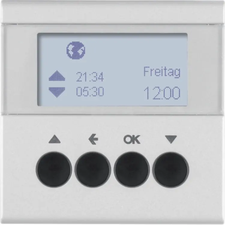 Hager Berker schakelklok opzetmodule voor jaloeziebesturing. Handmatige, tijdgestuurde en automatische bediening van jaloezie- en rolluikmotoren. Voorzien van instelbare tijdprogramma’s, astrofunctie met tijdverschuiving en vakantieprogramma. Niet geschikt voor het schakelen van verlichting. Exclusief binnenwerk en afdekraam.