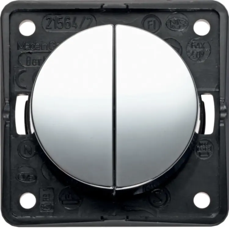 Hager Berker serieschakelaar, 10 AX, voor het bedienen van twee lichtpunten vanaf één plek. Niet voor wisselschakelingen. Serie: Integro Flow, kleur: glanzend chroom. Geschikt voor (bad)meubels, caravans of boten. Niet voor standaard muurmontage in huis.