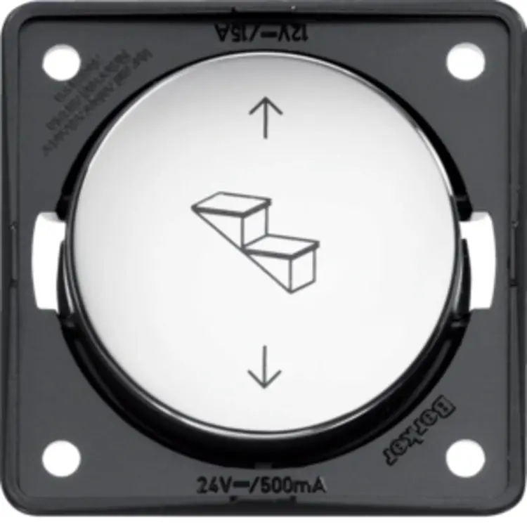Hager Berker impulsdrukker voor elektrische opstap, o.a. geschikt voor campers, 2-polig. Met traptrede- en pijlsymbool. Serie Integro Flow, kleur: aluminium mat. Meer informatie »