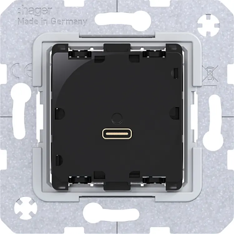 Hager Berker USB-wandcontactdoos met USB-C-poort voor snel opladen van mobiele apparaten (smartphones, tablets). Ondersteunt laadprotocollen: USB PD 3.0, PPS, BC1.2, Apple 2.4 A, Samsung 2A, QC4.0. Uitgang: 65 W, 3250 mA. Geschikt voor de Berker series: K.1/K.5/Q.1/Q.3/Q.7. Afdekken met centraalplaat en afdekraam.