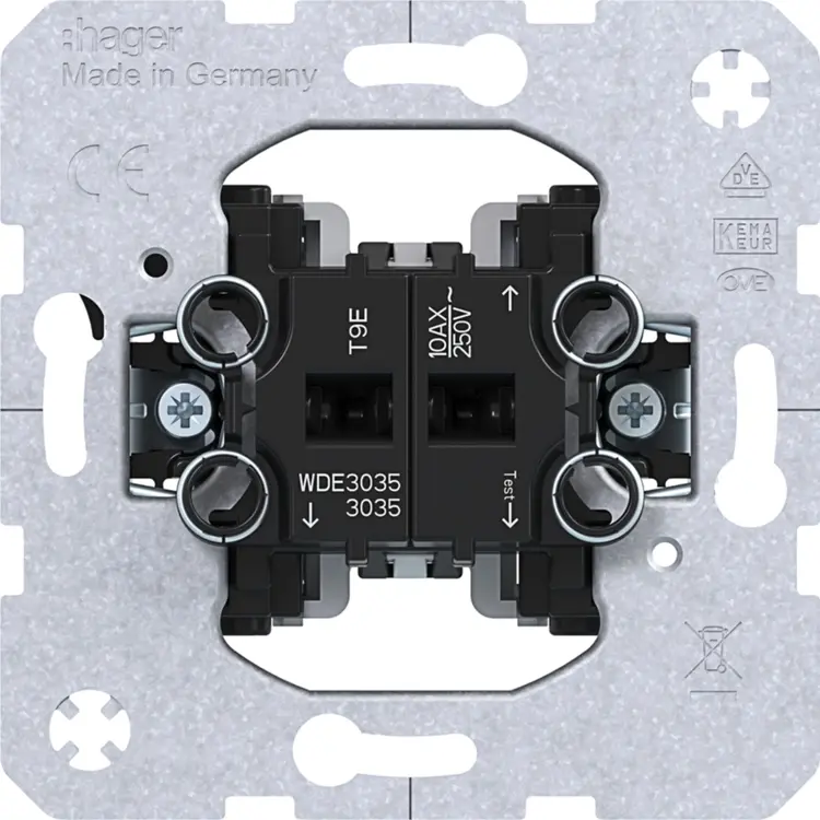 Hager Berker serieschakelaar, 10 A, voor het schakelen van twee afzonderlijke lichtpunten vanaf één plek. Niet geschikt voor wissel-/hotelschakelingen. Voorzien van klauwbevestiging (spreidklemmen). Afdekken met dubbele schakelwip en afdekraam.