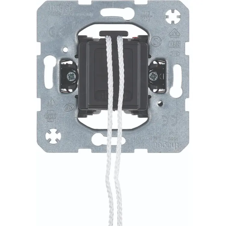 Hager Berker standaard 1-polige trek-wisselschakelaar, geschikt voor een enkelpolige schakeling of een wissel-/hotelschakeling. 10 A. Met klauwbevestiging (spreidklemmen). Afdekken met centraalplaat en afdekraam. Voor oriëntatie- of controleverlichting kan lampje 1675 worden gebruikt. Let op: bij controleverlichting moet de nuldraad worden aangesloten.