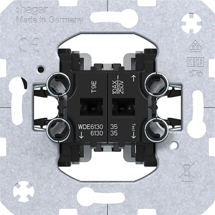 Hager Berker serieschakelaar, 10 A, voor het schakelen van twee afzonderlijke lichtpunten vanaf één plek. Niet geschikt voor wissel-/hotelschakelingen. Zonder klauwbevestiging (spreidklemmen). Afdekken met dubbele schakelwip en afdekraam.