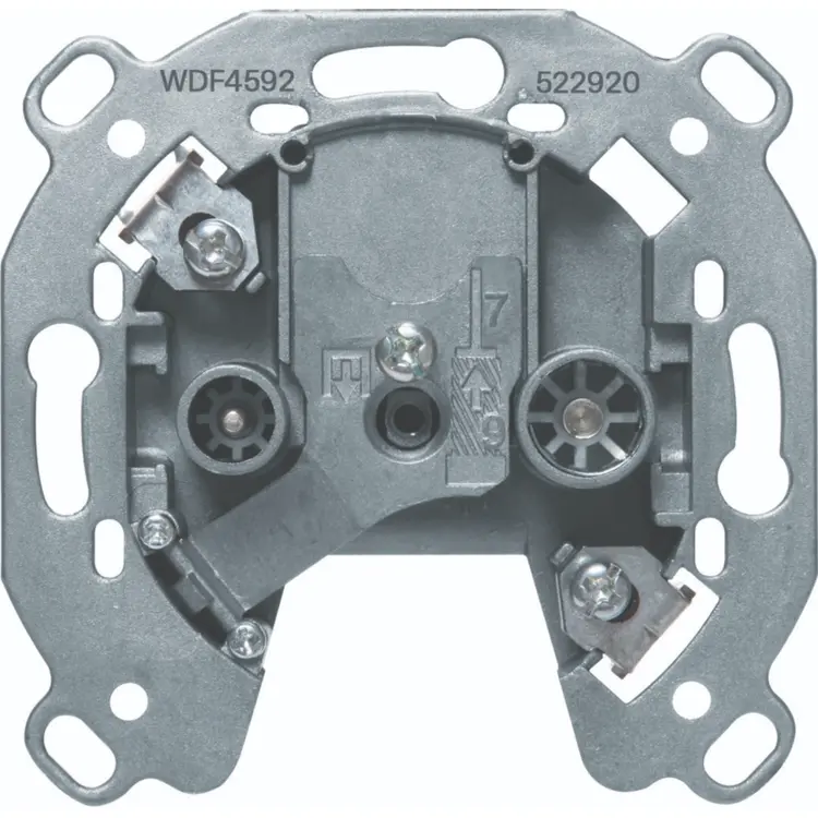 Hager Berker ronde inbouw antenne-/COAX-einddoos (radio/tv), geschikt voor 1930/R series schakelmateriaal (ronde afdekkingen). Frequentiebereik: 5 - 2400 MHz. Aansluit? en doorgangsdemping: ca.?4 dB bij 860 MHz, 5 dB bij 2150 MHz. Geschikt voor kabelmodem. Voeding op afstand mogelijk. IP20, bevestiging met schroef.