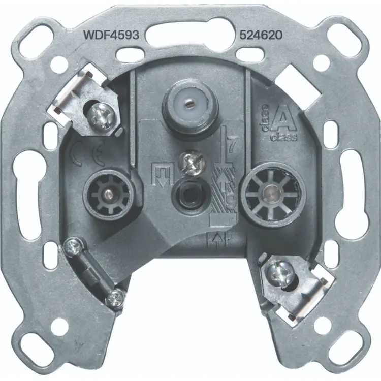 Hager Berker ronde inbouw antenne-/COAX-drie-gats einddoos (radio/TV/satelliet), geschikt voor 1930/R-series schakelmateriaal (ronde afdekkingen). Frequentiebereik: 5–2400 MHz. Demping: ca. 5,5 dB bij 860 MHz; 2 dB bij 2150 MHz.