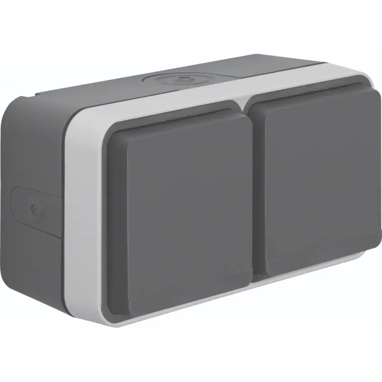 Hager Berker W1 grijs stopcontact 2-voudig randaarde met behuizing, horizontale montage. 4 invoeren, - 2 extra leidinginvoeren aan de zijkant en twee kabelinvoeren voor geleiders of buis. IP55 waarde voor gebruik buiten. Meer informatie »