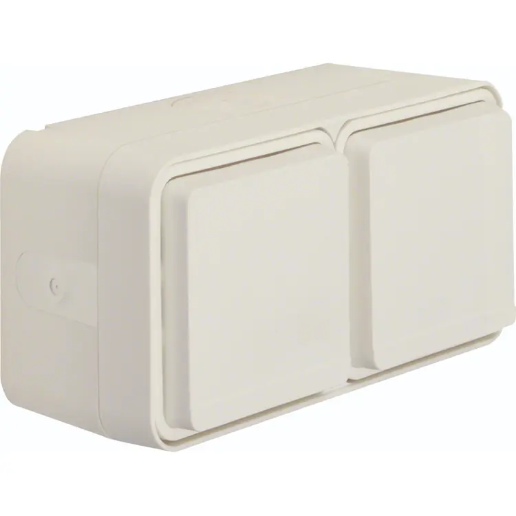 Hager Berker W1 wit stopcontact 2-voudig randaarde met behuizing, horizontale montage. 4 invoeren, - 2 extra leidinginvoeren aan de zijkant en twee kabelinvoeren voor geleiders of buis. IP55 waarde voor gebruik buiten. Meer informatie »